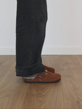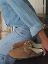 Zueco de piel color camel con planta anatómica Genuins y hebilla ajustable. Interior y planta forrada de cálida y suave lana color beige.
